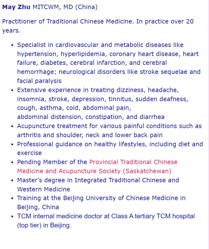 - Member of the Provincial Traditional Chinese Medicine and Acupuncture Society (Saskatchewan)